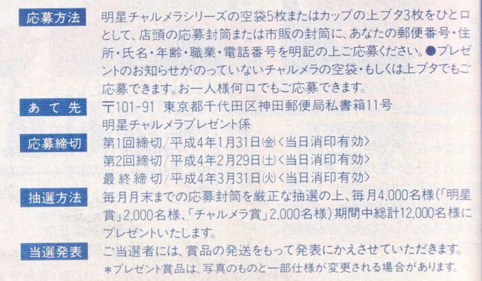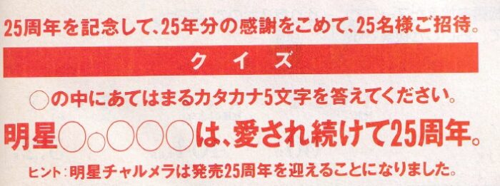 今回ご紹介した、1992年(平成4年)「明星食品 明星チャルメラ25周年記念キャンペーン」では25周年。